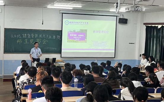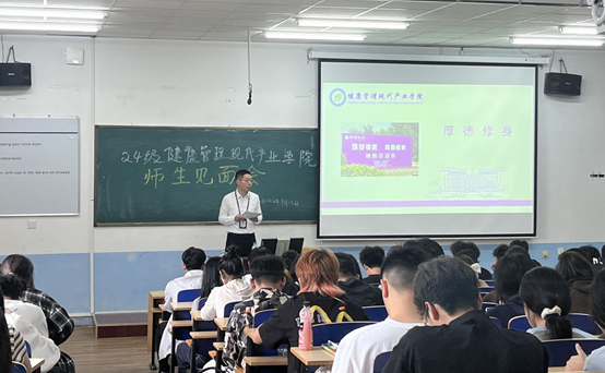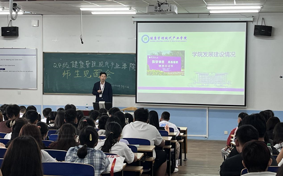 大会主要从学院发展建设情况、教学管理规定以及厚德修身三个方面展开进行。首先由马春宇院长介绍学院发展建设情况,马春宇院长简单介绍了学院的发展前身及目前的建设情况,目前学院有五个专业,分别是公共事业管理、医疗保险、健康服务与管理、智能医学工程以及今年新开设的生物医药数据科学专业,并对143名新生的到来表示热烈欢迎,希望他们能够在健康管理现代产业学院这个大家庭快乐地度过四年大学时光。