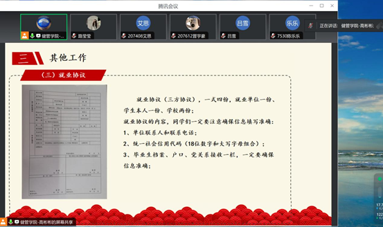 会议由高彬彬老师主持。首先,由教务科科长吴琼老师从毕业实习相关事宜以及毕业论文相关材料两个部分展开,并重点讲解了毕业论文的相关事宜,针对同学们疑惑的问题进行了一一解答。随后,由学生科副科长高彬彬老师从毕业生的日常管理工作入手,结合当前的时间节点,对照同学们在求职过程中容易出现的问题,为同学们答疑解惑,并提醒同学们增强忧患意识,积极应对挑战,提高自身素质,灵活调整求职策略。