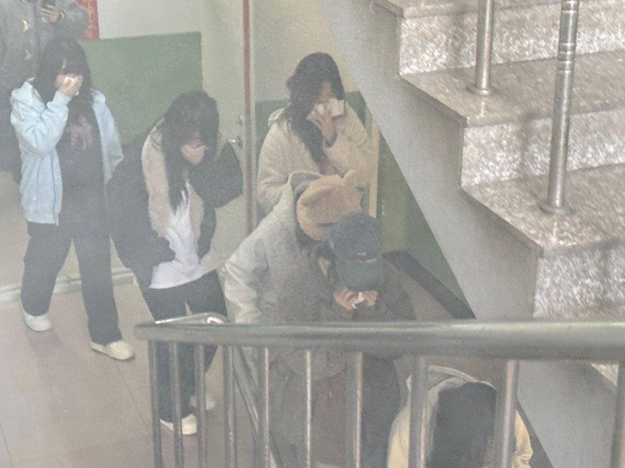 演练前,学院成立专项工作领导小组,明确总指挥、安全员、辅导员、宿管员及6名学生及教师志愿者的职责分工,完成物料准备、流程确认、动员预告等前期工作。下午2点,演练正式启动。志愿者在指定区域设置“明火障碍”、释放安全烟饼模拟浓烟环境,楼层志愿者及时发出疏散警报。宿舍内学生迅速响应,用毛巾或袖口捂住口鼻,低姿沿西侧安全通道有序撤离,全程听从引导、互不推挤。