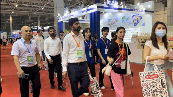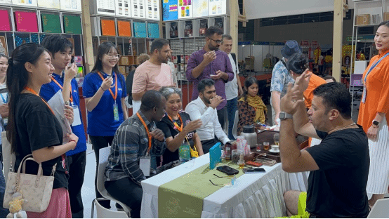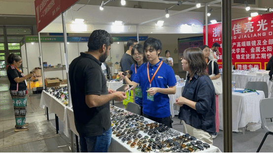 采购对接会之余,海外采购商逐一走访展位,详细了解产品参数及市场状况,现场选取样品及沟通下单事宜,交流合作氛围浓洽。学生志愿者也根据需要,实时陪同,与外商交谈,了解沟通参展方的需求,为意向合作的双方提供口译、沟通服务。