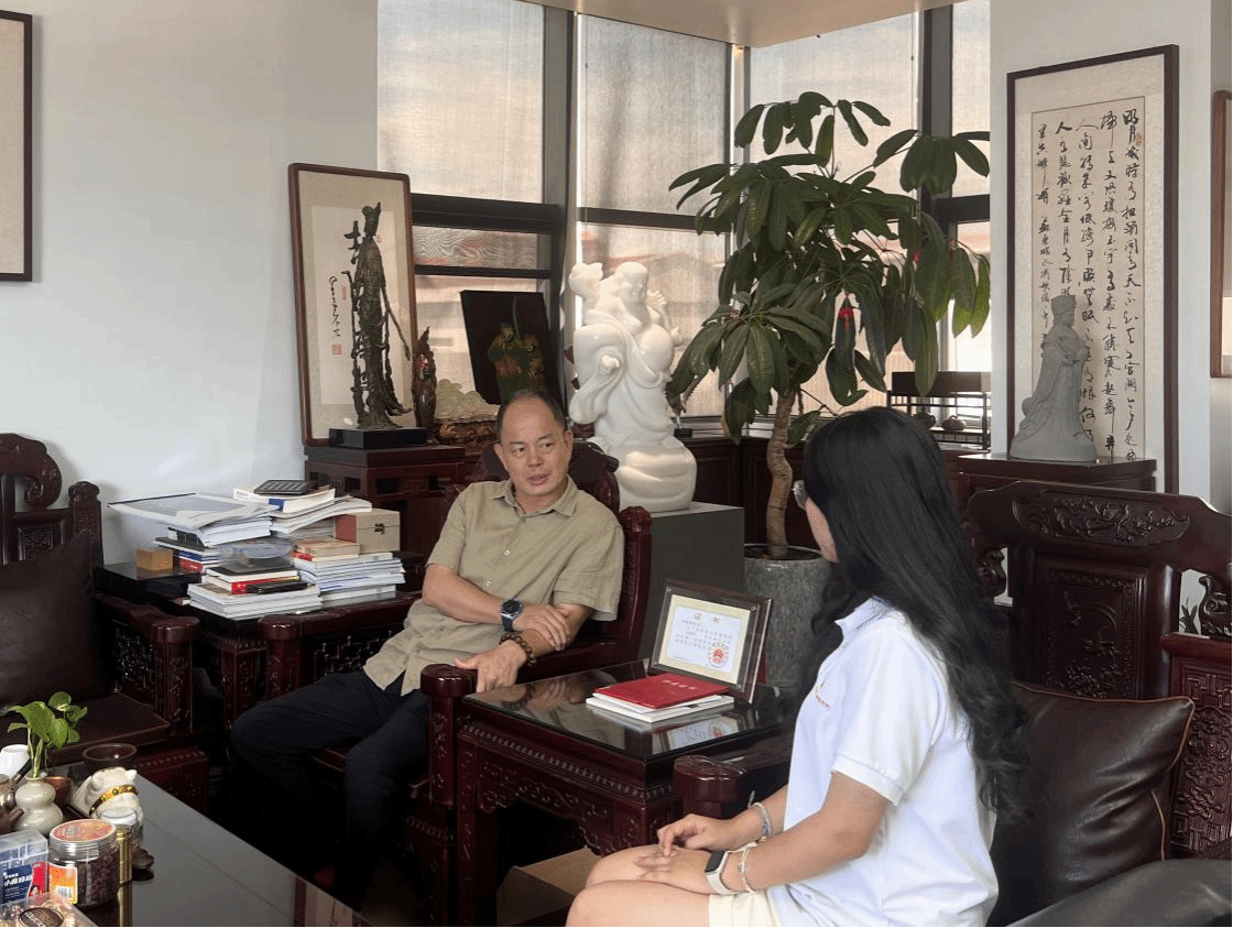 在一系列的场馆学习之后,实践队采访了两位非遗文化传承人——国家级非遗文化传承人吴德强和市级非遗文化传承人张振雄。吴德强大师强调在保留传统技法的同时要积极探索创新,将现代元素融入石雕创作中。他展示了几件融入现代设计理念的石雕作品,启发了队员们对传统文化与现代艺术融合的思考。张振雄大师分享了他对石雕技艺的执着与热爱,讲解了石雕创作过程中面临的挑战以及如何保持技艺的纯粹。他希望通过自己的努力让惠安石雕焕发新生机与活力。