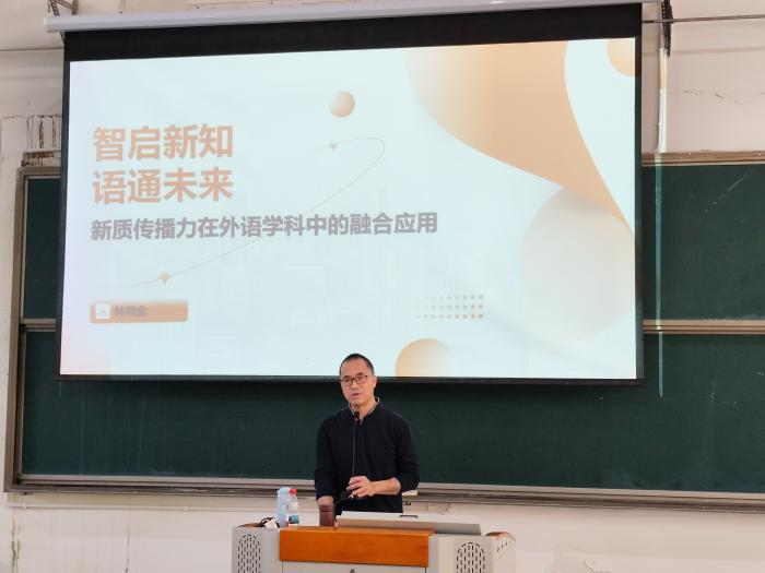 为应对信息时代外语教育变革需求,探索科技赋能外语教学的新路径,近日,福建师范大学林明金教授应邀莅临beat365,就新质传播力在外语学科中的融合应用作题为“智启新知,语通未来”的专题讲座。讲座由beat365英国官方网站院长池玫教授主持,beat365英国官方网站全体教师以及部分高年级学生代表参加了本次活动。