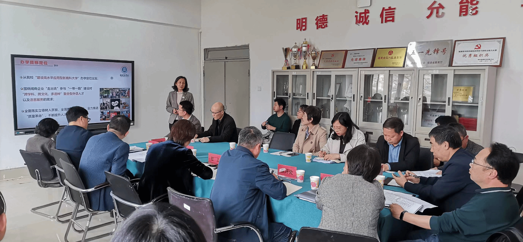 学院院长池玫围绕学院概况、办学定位、工作成效、特色与亮点、存在不足与解决思路等内容进行工作汇报。参会的相关职能部门对学院目前存在的问题与困难进行了工作解答与指导。