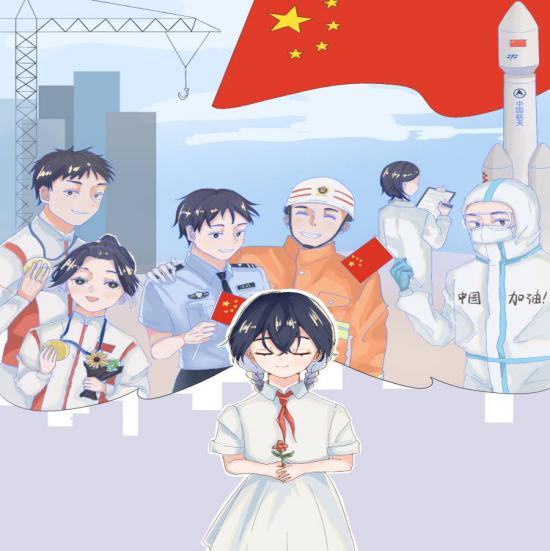 同学们以书法和绘画的形式,从回顾历史发展、赞美祖国河山、歌颂榜样人物等方面进行创作,立意新颖,紧扣主题,弘扬爱国主义主旋律,传播正能量。20级日语2班王忻妍同学临摹的《清平乐·六盘山》,一撇一捺,舒展大方,运笔流畅,字字溢香。作品回顾了长征的胜利,表达了红军北上抗日的坚强意志,歌颂了革命先烈们不忘初心、众志成城的精神。20级日语1班陈光胜宇同学将不同行业的青年同志们聚在同一幅画中,身后高楼林立,五星红旗迎风飘扬,体现出中华民族迎来了从站起来、富起来到强起来的伟大飞跃,迎来了实现伟大复兴的光明前景,呼吁新时代青年应珍惜今天来之不易的和平生活,以满腔热情投入到伟大祖国的建设事业中。一幅幅作品以笔为意,情寄翰墨心,以纸为韵,书写爱国情怀。爱国情怀不在笔尖,不在纸上,而在心中,同学们用行动庆贺祖国华诞,以赤子之心礼赞中华盛世。