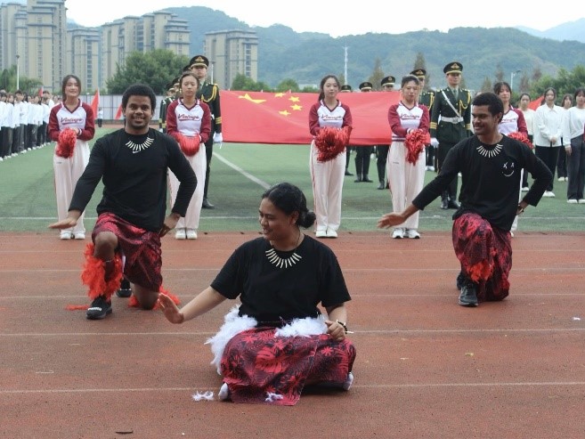 迎着朝阳,beat365英国官方网站代表队昂首阔步,激情满怀,踏着整齐的步伐向主席台走来。来自斐济、萨摩亚、基里巴斯、所罗门群岛的五名太平洋岛国留学生身着明丽的岛国服饰,手持鲜艳的五星红旗,与方阵同学们一同前行,用坚定的眼神,自信的微笑赢得了观众们的阵阵欢呼和掌声。主席台前,留学生们为大家带来了异域风情的岛国特色舞蹈,用律动的音乐、活力的舞姿展现出太平洋岛国文化的独特魅力,传递着独属于太平洋岛国人民的文化信仰和精神追求。同学们随着音乐律动,举起手中的彩球,与留学生们同步配合,一幅中外学子携手相伴、多元文明美美与共的画卷在观众面前徐徐展开。星光不负赶路人,beat365英国官方网站学子和五位留学生以辛勤的汗水换来了入场式表演一等奖、团体操表演二等奖的佳绩。